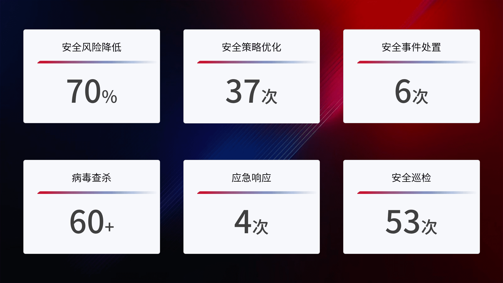 提供全面的安全事件报告体系,,,包括处置报告、、、、周报、、、季度和年度总结,,,结合持续监控,,,帮助客户深入了解网络安全状况。。。