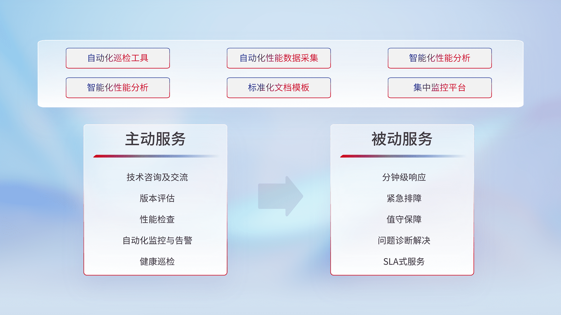 智能化工具和标准化文档,,,保障服务质量,,提供主动服务(包含技术咨询、、、、版本评估、、性能检查、、自动化监控与告警、、、健康巡检)和被动服务包含(分钟级响应、、紧急排障、、值守保障、、问题诊断解决、、SLA服务)。。